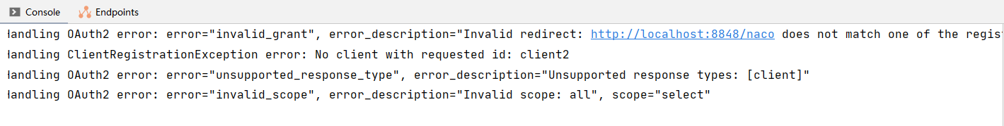 注意url中请求的参数必须和在数据库中的表oauth_client中配置的相同,如果不存在或信息不一致都会报错,在参数填写错误时会产生如下报错信息: