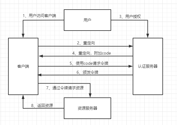 在OAuth2中,定义了4种不同的授权模式,其中授权码模式(authorization code)功能流程相对更加完善,也被更多的系统采用。首先使用图解的方式简单了解一下它的授权流程: