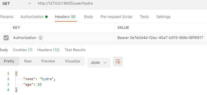 使用Postman,在Authorization中配置使用Bearer Token,并填入从认证服务器获取的access_token(或在Headers中的Authorization字段直接填写Bearer 'access_token'),再次访问接口,可以正常访问接口资源: