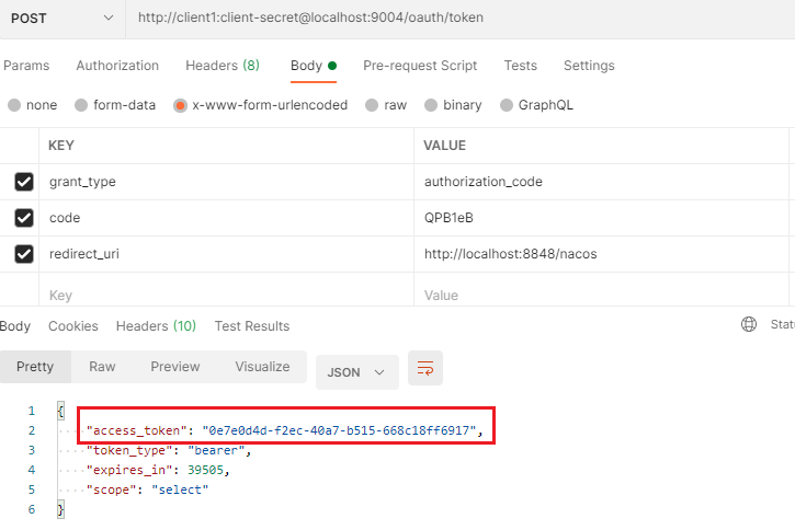 这样,就通过/oauth/token端点获取到了access_token,并一同拿到了它的令牌类型、过期时间、授权范围信息,这个令牌将在请求资源服务器的资源时被使用。